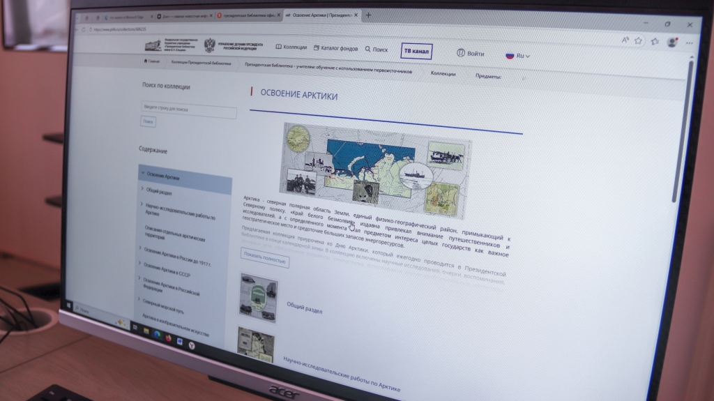 Для собравшихся был проведен обзор коллекции Президентской библиотеки «Освоение Арктики», которая отражает наиболее полное собрание документальных и аудиоматериалов по истории исследования арктических территорий. Особый интерес учащиеся проявили к кинохронике «Научная экспедиция под руководством И. Д. Папанина на Северный полюс».