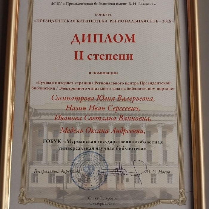 Мурманская государственная областная универсальная научная библиотека награждена Дипломом II степени в номинации «Лучшая интернет-страница Регионального центра Президентской библиотеки/Электронного читального зала на библиотечном портале».