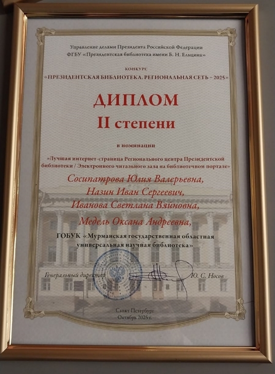 Мурманская государственная областная универсальная научная библиотека награждена Дипломом II степени в номинации «Лучшая интернет-страница Регионального центра Президентской библиотеки/Электронного читального зала на библиотечном портале».